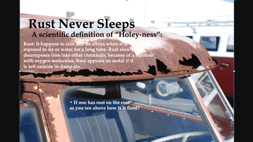 The Neil Young album, “Rust Never Sleeps” was released in 1979. The name of that album never left me and years later, as I worked with a non-profit organization called zMAD (Zedbridge Make a Difference), a leadership academy for at-risk kids, “rust never sleeps” started percolating. Too, I had a classic VW bus that I was restoring at the time that was in the body shop for close to nine months and again and again my main body man, Lavant would ask… With the depth of this rust it looks like we need to cut it out and weld in new metal, Steve… On this one, we could fix the dent and with just surface rust we could get by with bondo, primer and paint… What do you want to do?